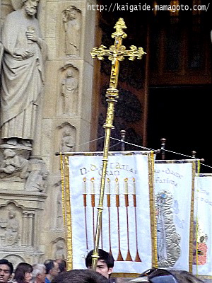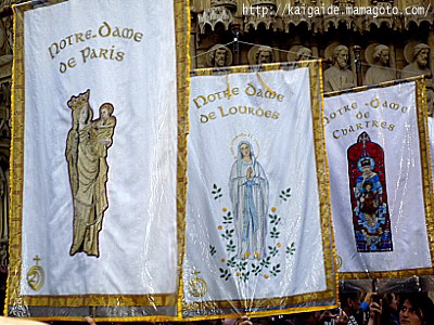 各地からパリに集まってきた教会のものかと思われる幕(?)が