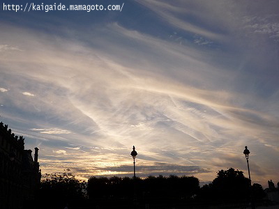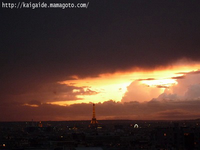 ちょうど日没の時間。エッフェル塔の向こうの空だけ割れていました。