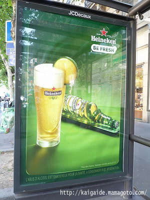 バス停の広告。Heinekenは作風が凝っていて、パリに来るたび