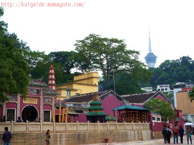 バスを待っている間に撮った“媽閣廟”と“マカオ・タワー”。
